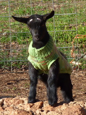 As the post title says, these are my third pattern for baby goat coats. My first baby goat coat was for a March-born kid. I was worried about dipping night temperatures, so I made a